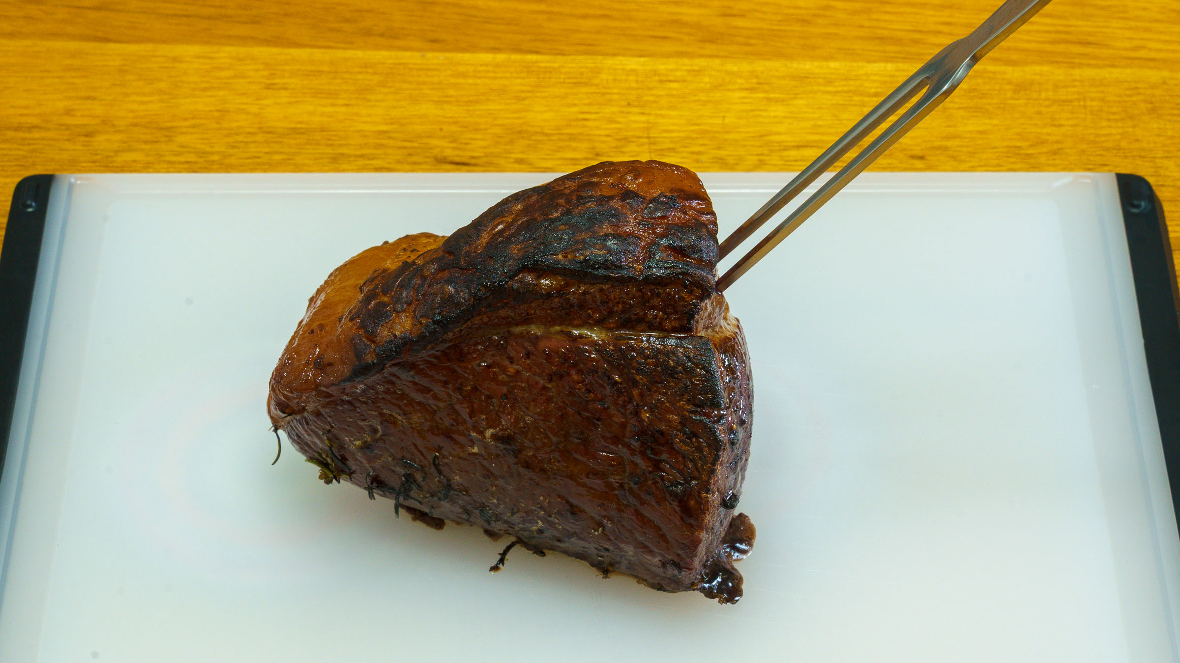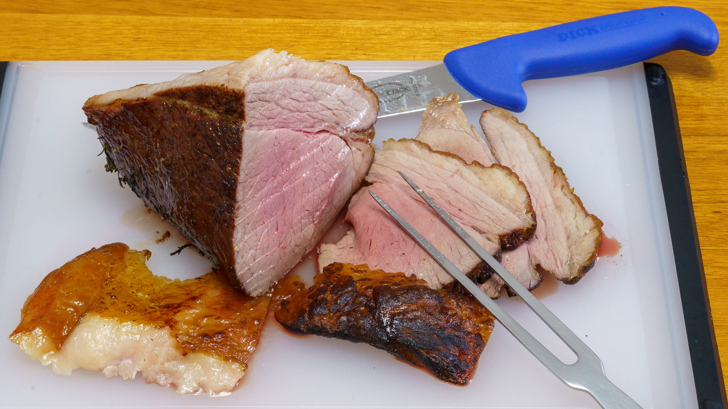 A photograph of the cooked beef on a cutting board with slices of meat and fat. The butchers knife and carving fork are included.