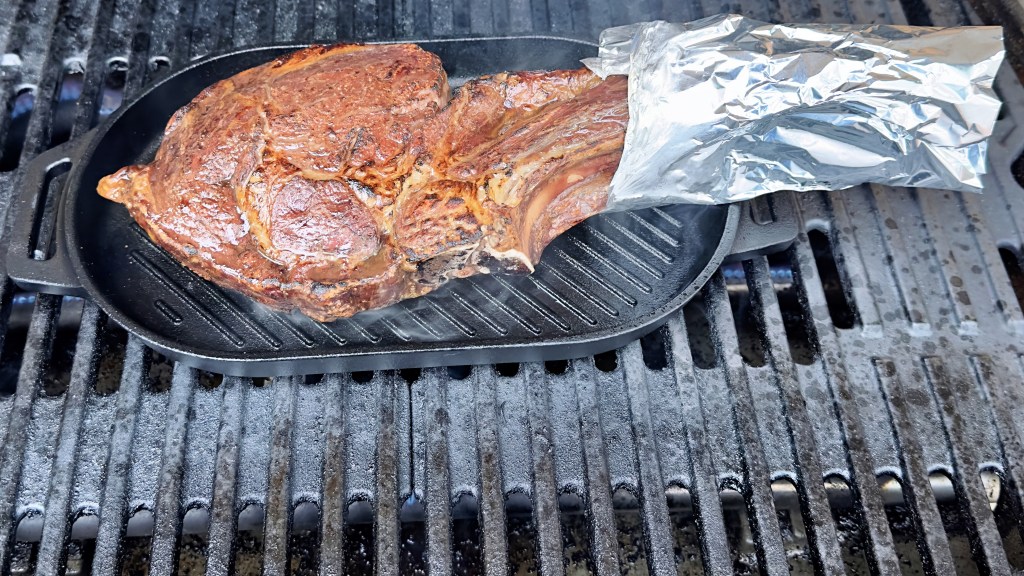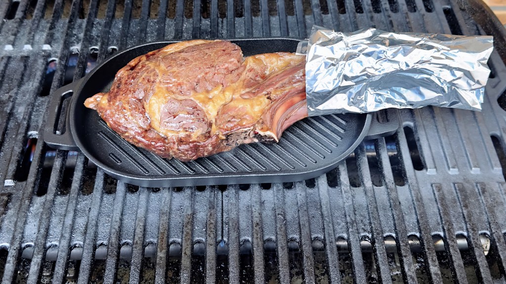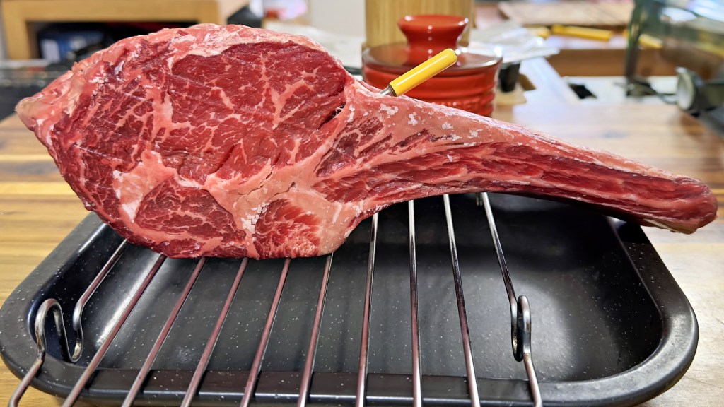 Preparing a tomahawk steak requires some attention to detail. Regardless of the method, some steps are worth taking to achieve good results. Some people allow the steak to sit at room temperature for approximately one hour before cooking.2 Allegedly, this allows the internal temperature of the meat to rise slightly, promoting even cooking throughout. (I’m not convinced). Salt helps enhance the flavours of the beef.47 I like dry brining, where the steak is salted up to 48 hours in advance and left uncovered in the refrigerator, which can intensify the flavour and improve tenderness.47 The exposed rib bone can be wrapped in aluminium foil for presentation purposes and to prevent scorching, although this step is optional.2 A valuable tool is a reliable meat thermometer. Using a thermometer to monitor the internal temperature is an accurate way to achieve the desired level of doneness.2 Finally, once the steak has reached the target temperature, rest for 10 to 15 minutes before slicing and serving.2 This resting period allegedly allows the juices within the meat to redistribute, resulting in a significantly more tender and flavourful final product.