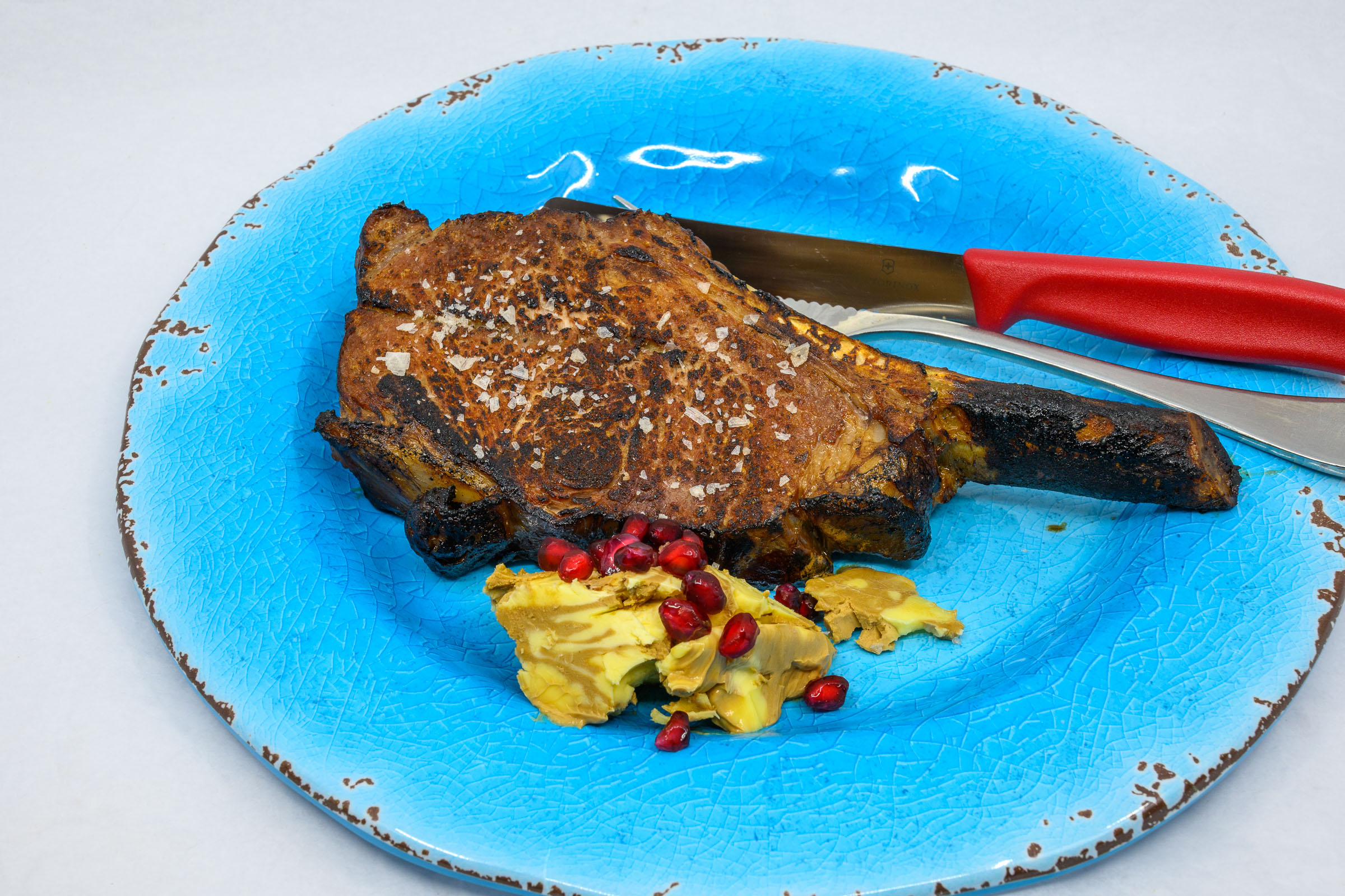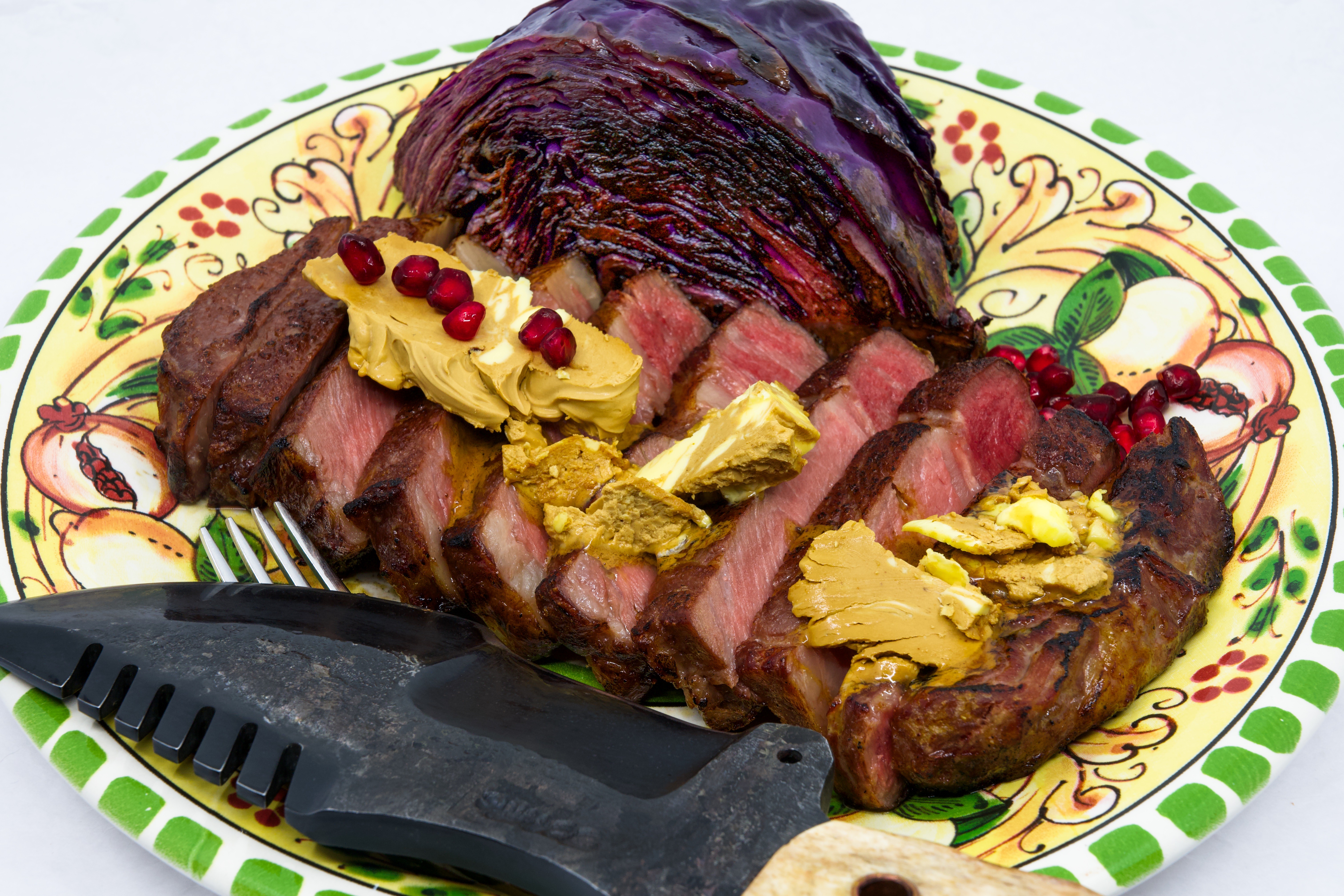Grass-fed scotch fillet steak, red cabbage, whipped Vegemite butter, and pomegranate arils