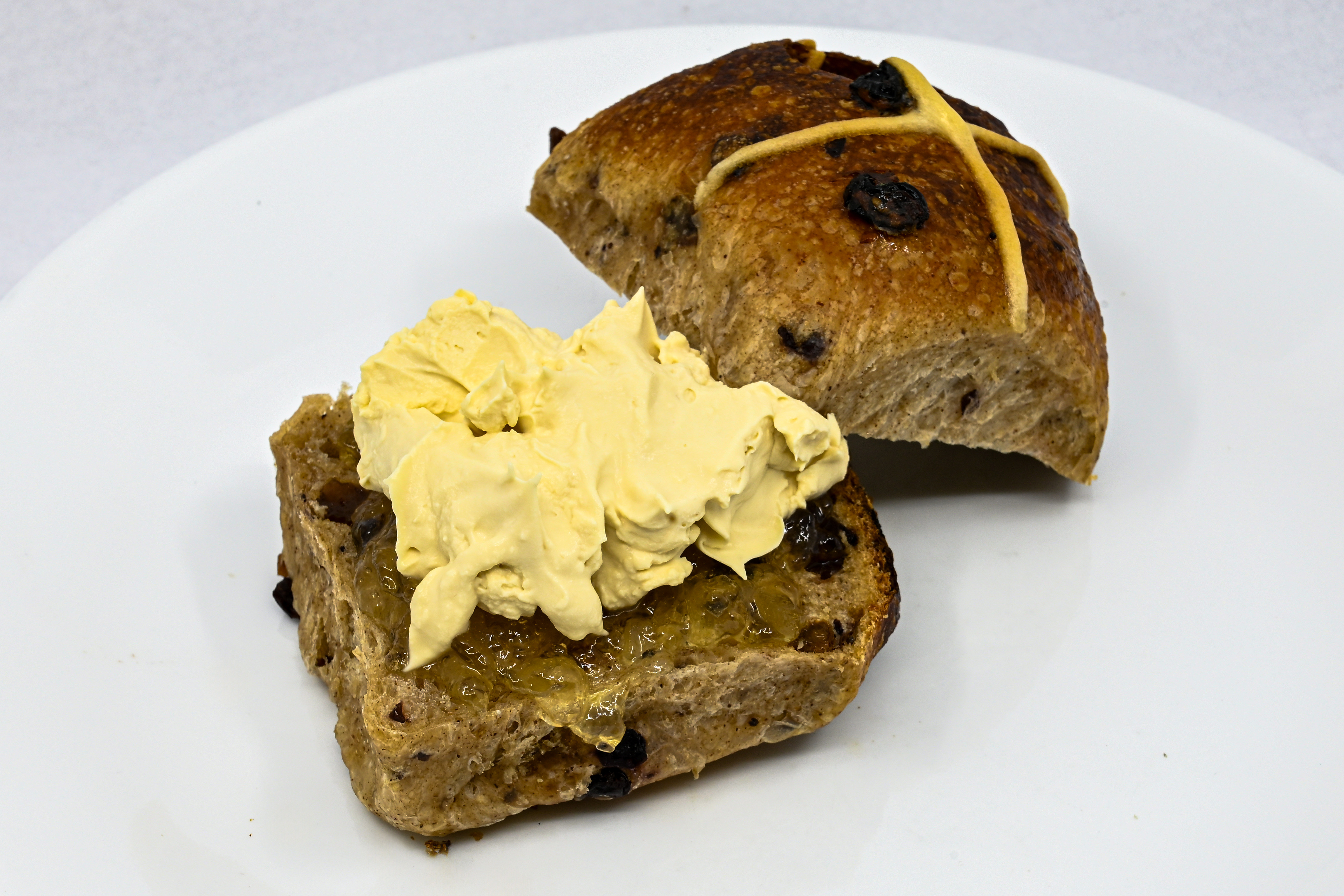 A sourdough hot cross bun with fruit is a great alternative to a scone. The cream was whipped pure-pouring Cream (300 mL), and the “jam” was Ginger Marmalade (365 g). Marmalade also featured on the “spreads” episode of the Lunchbox Envy podcast.