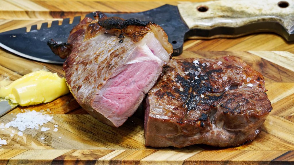 - Sear the steak with a gas torch while placed on a barbecue grill.