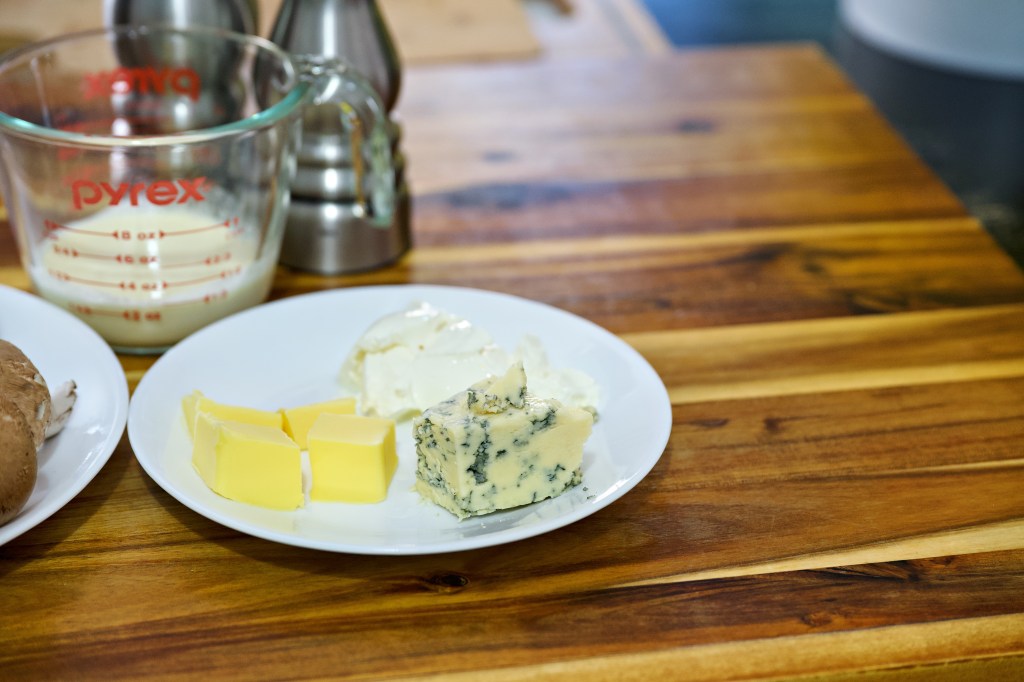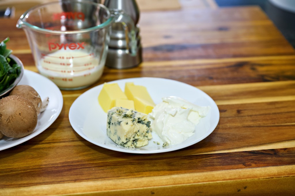 - Crumble in the blue vein cheese. Remember to stir constantly. Continue to cook for 2–3 minutes. Cook until the sauce thickens enough to coat the back of a spoon.