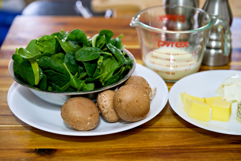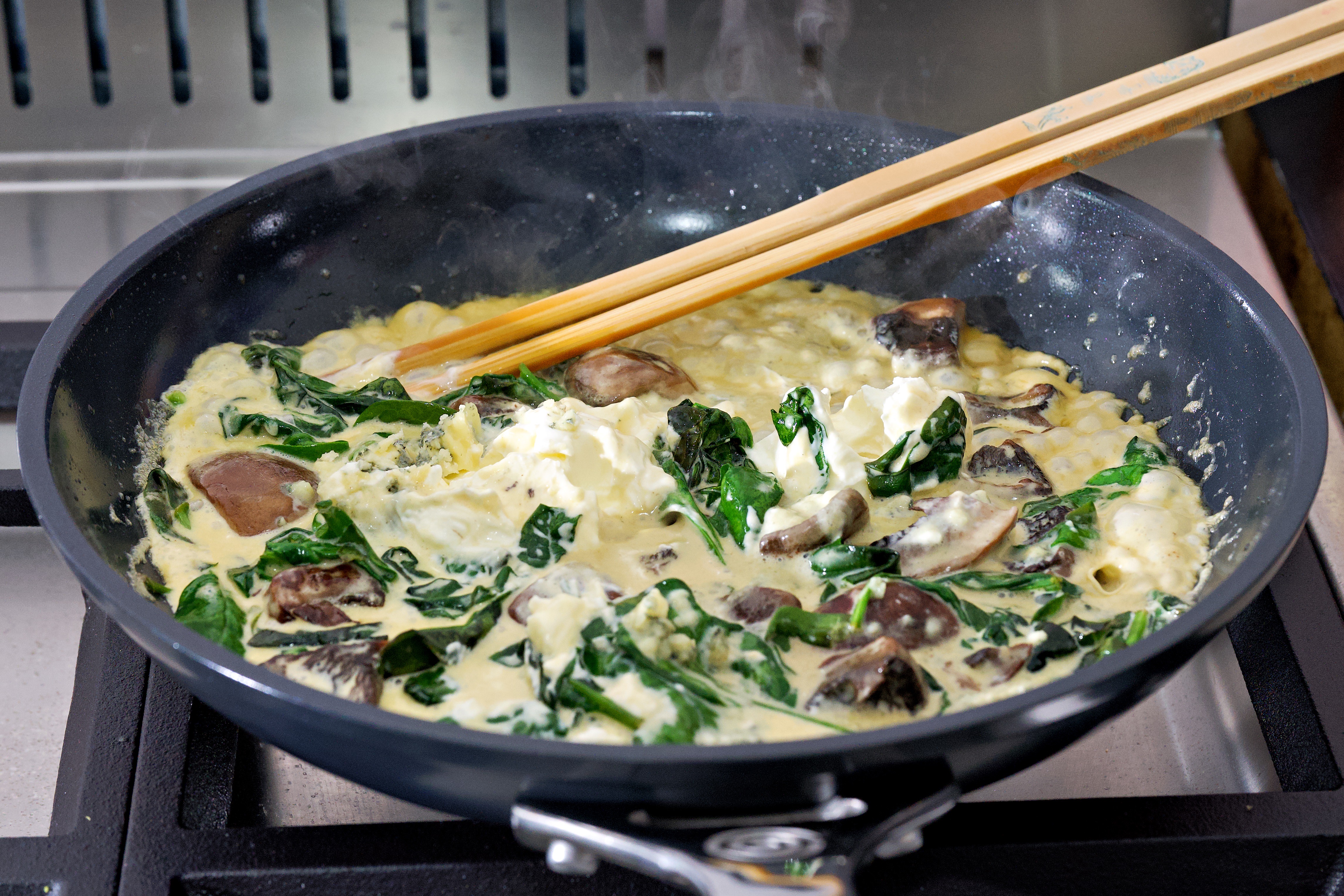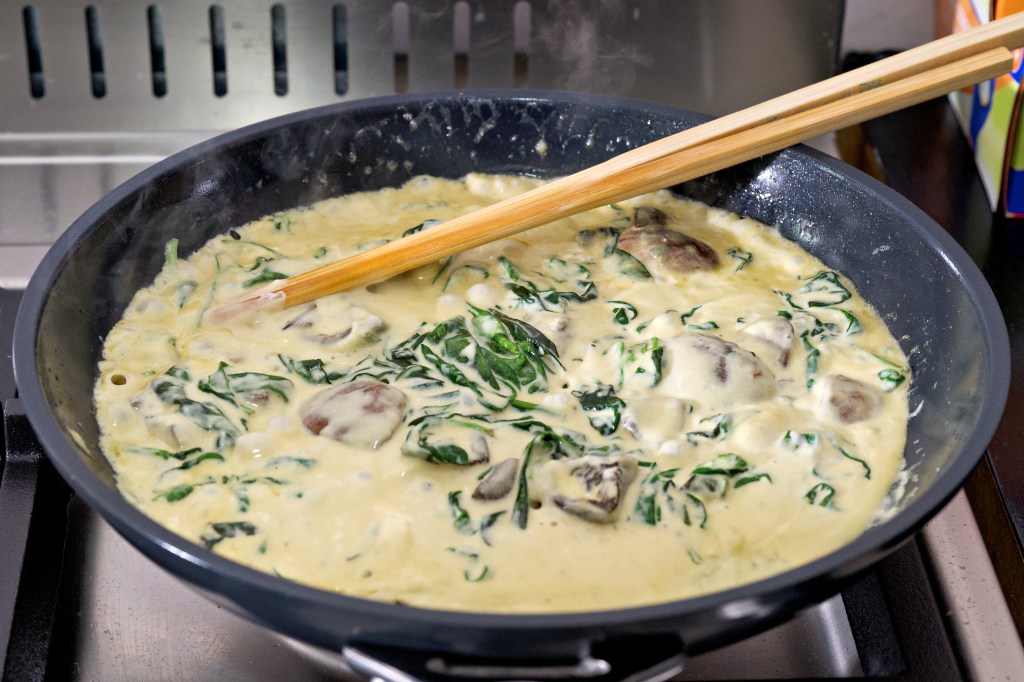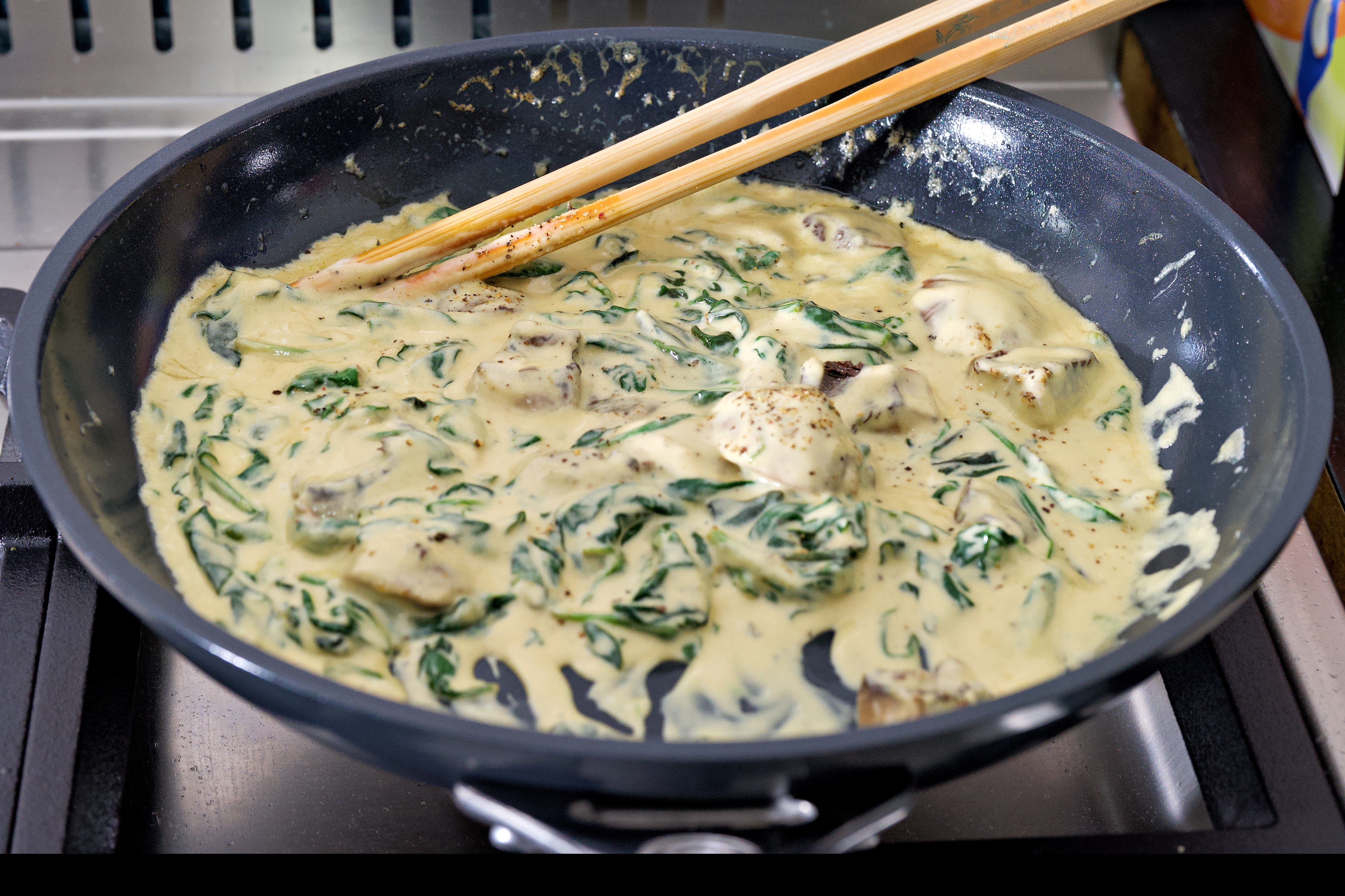 - Once all the spinach is wilted, reduce the heat to medium. Stir through the cream cheese and heavy cream until the mixture is smooth and glossy.