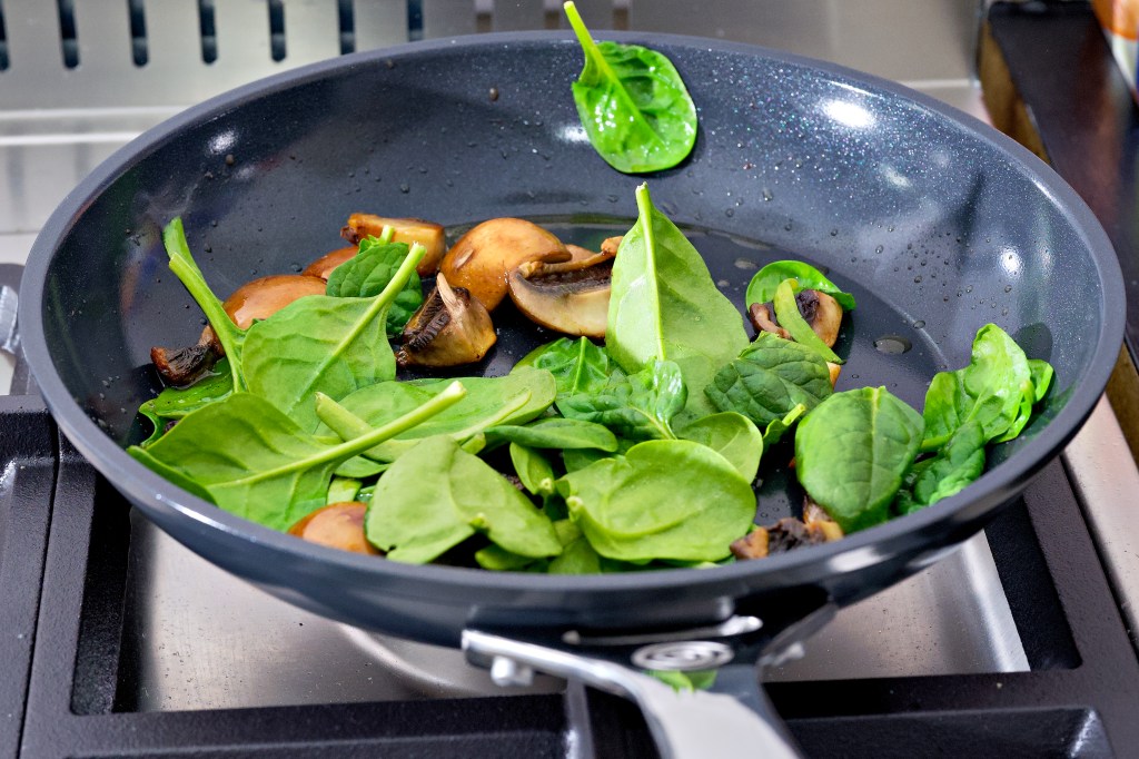 - Increase the heat to medium–high and add the spinach in batches, stirring each handful until just wilted before adding more.