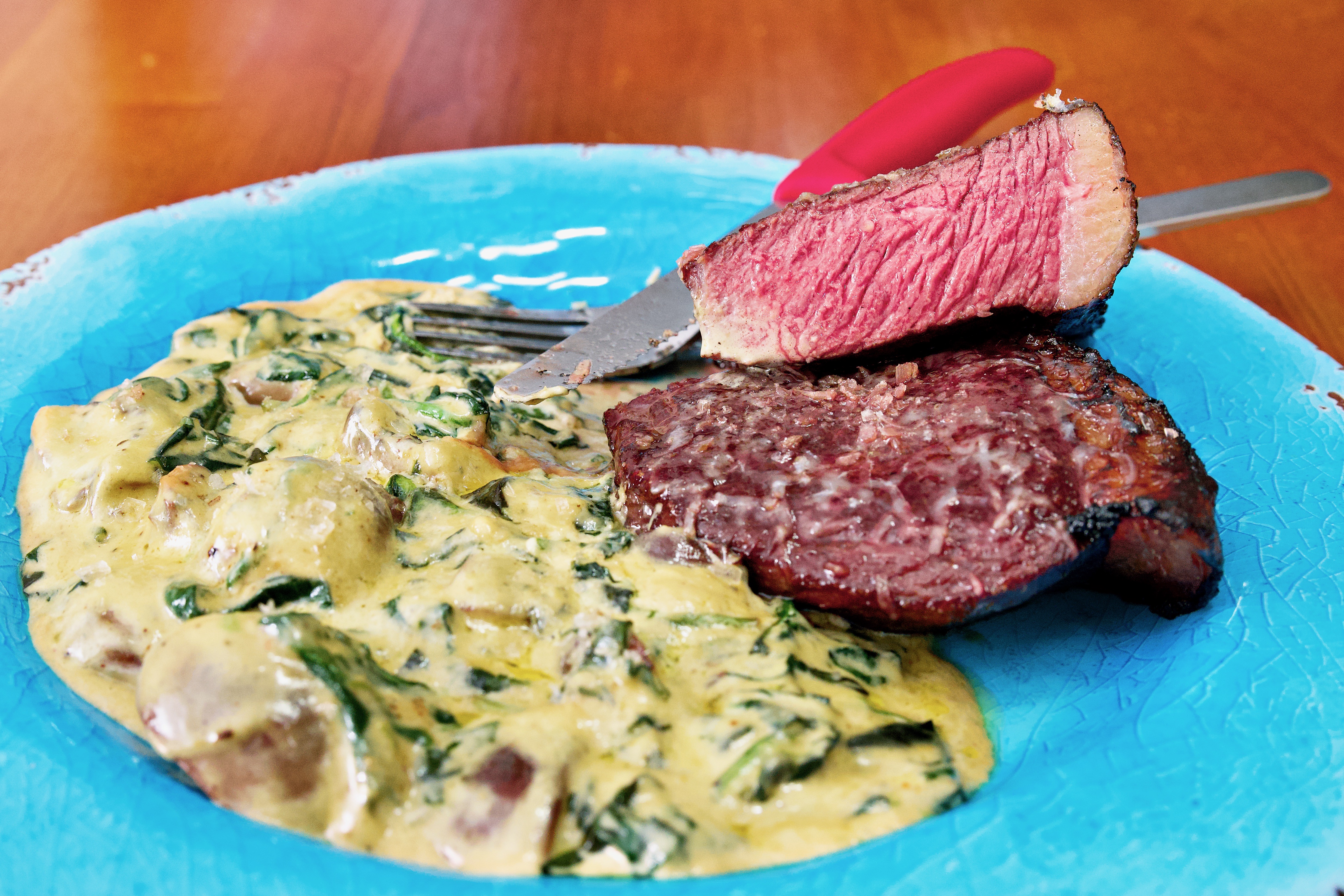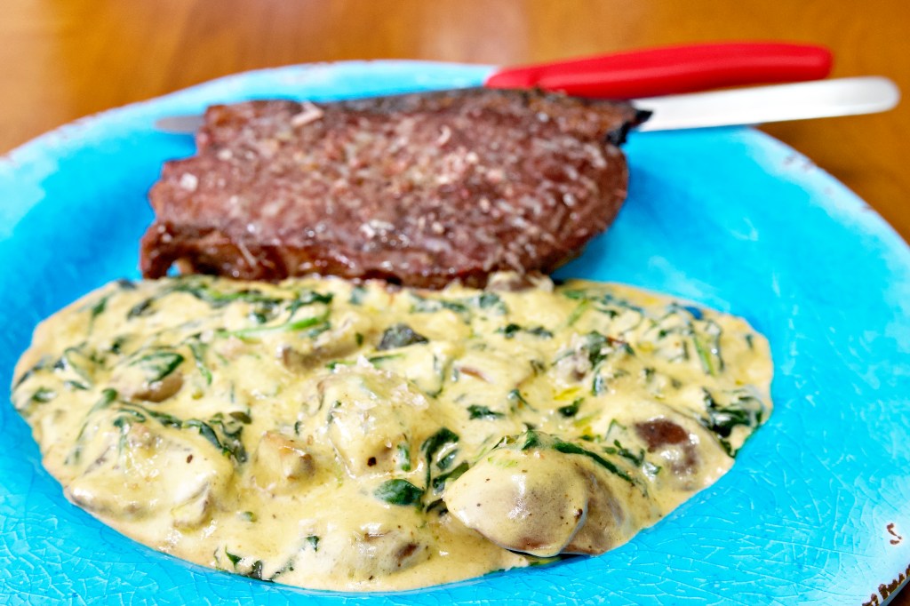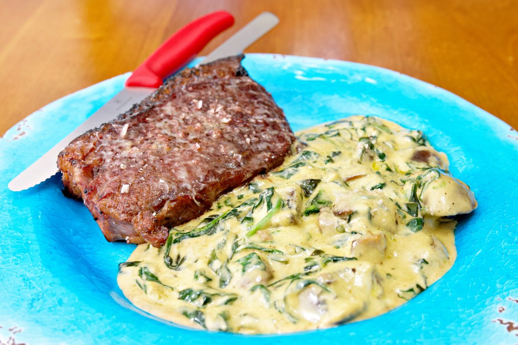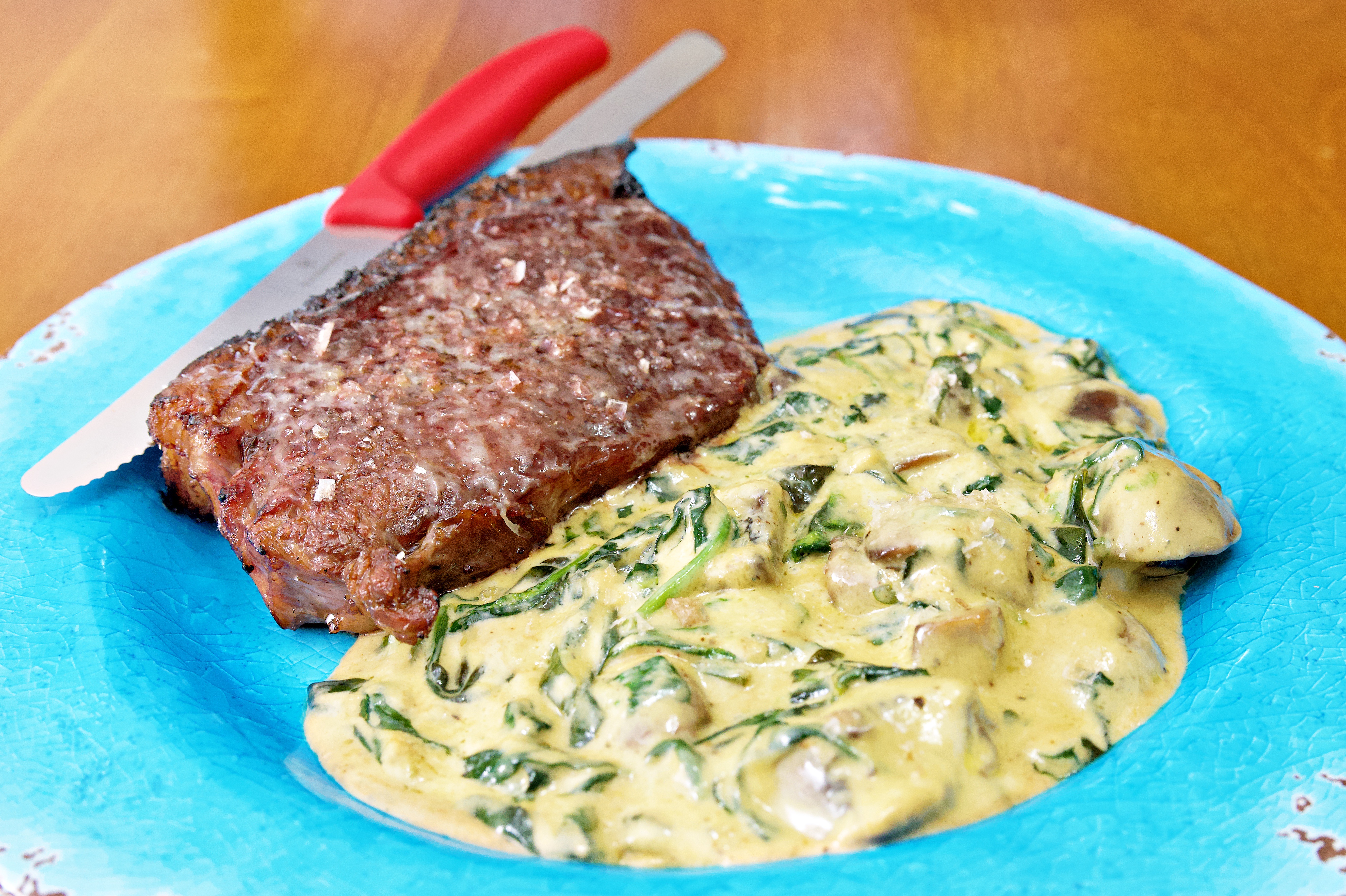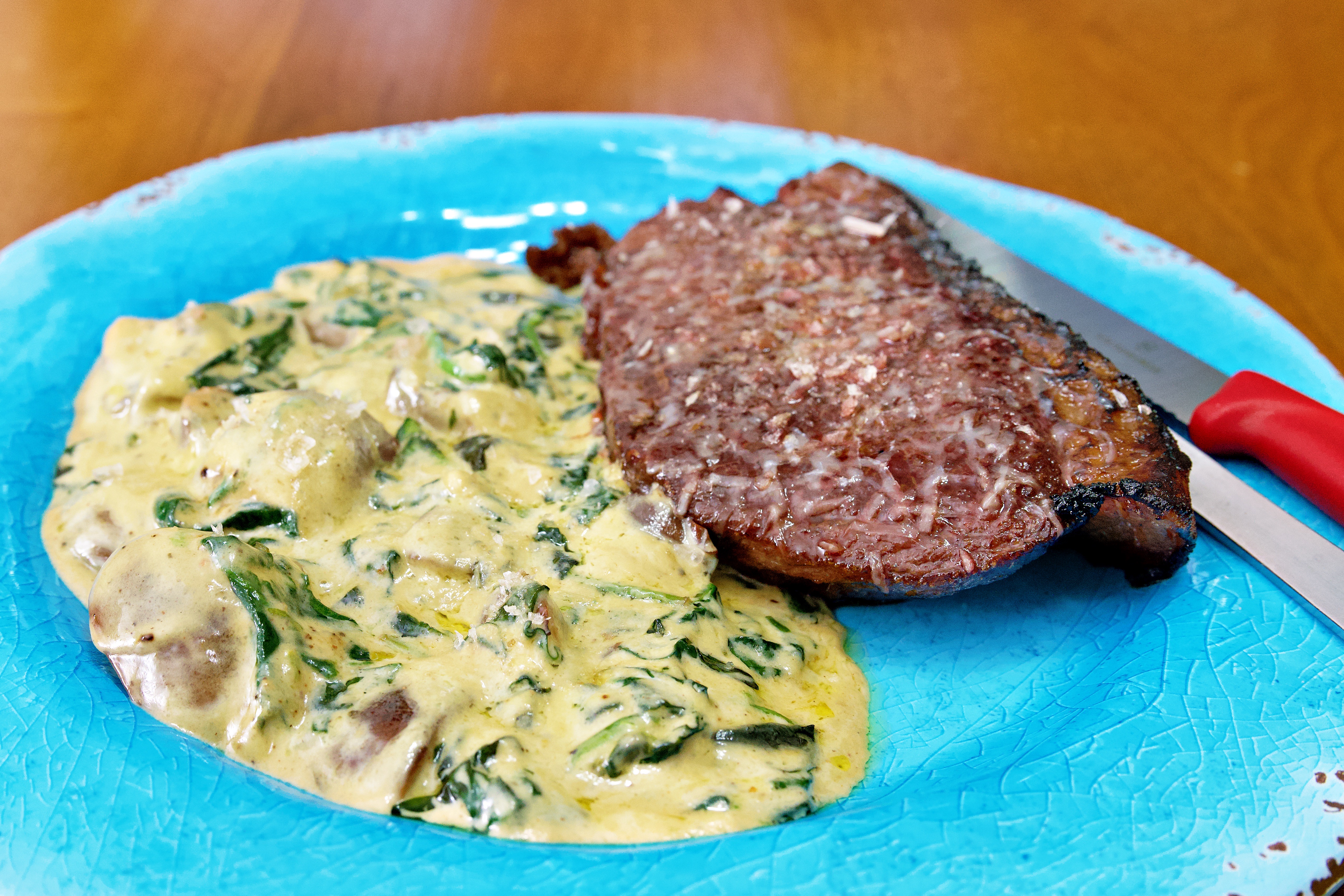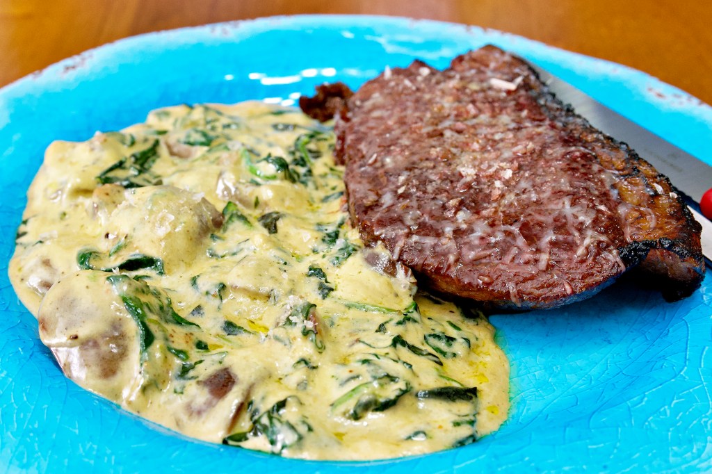 - I had the creamed spinach as a side dish with a rump cap steak. The steak and creamed spinach go well together.