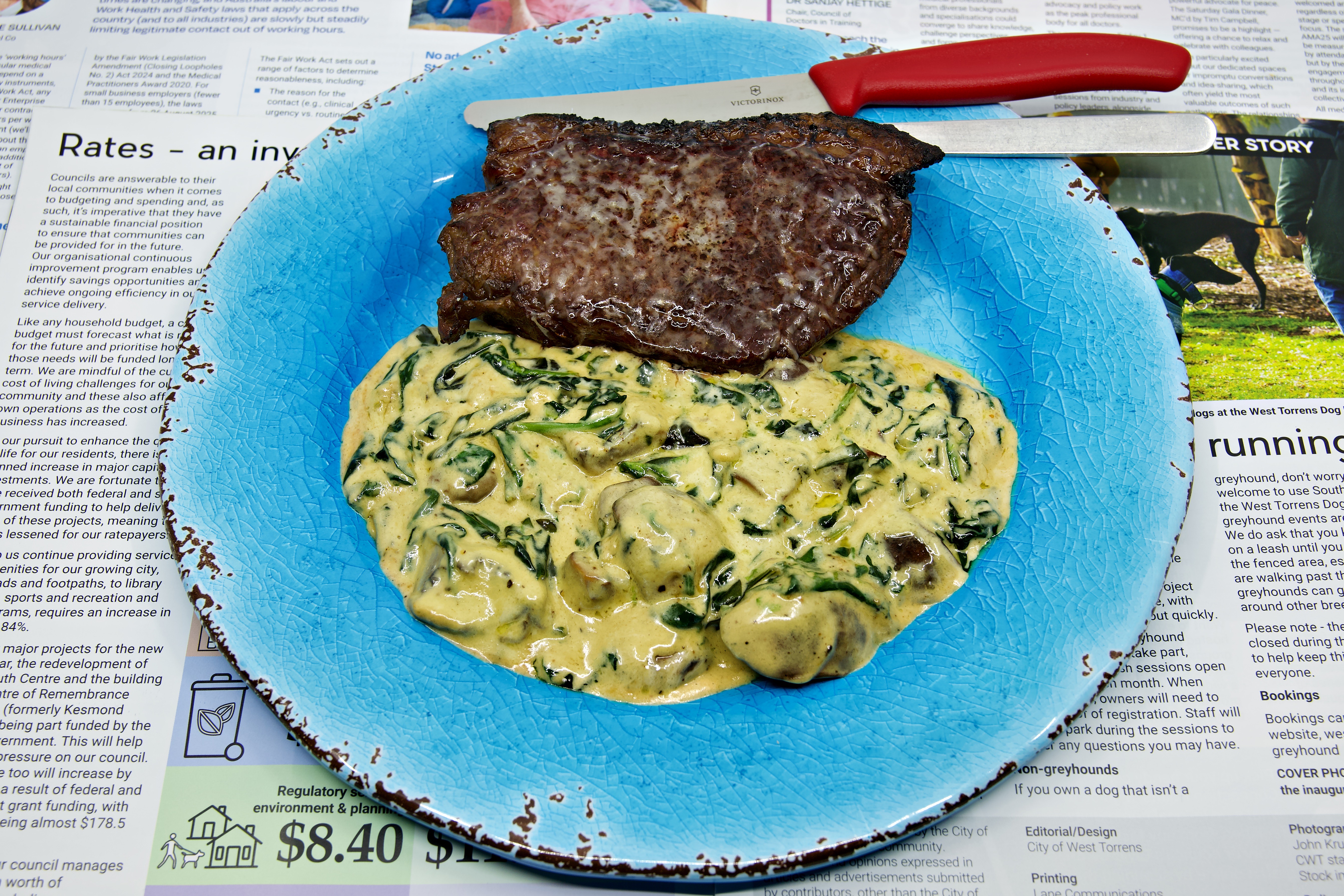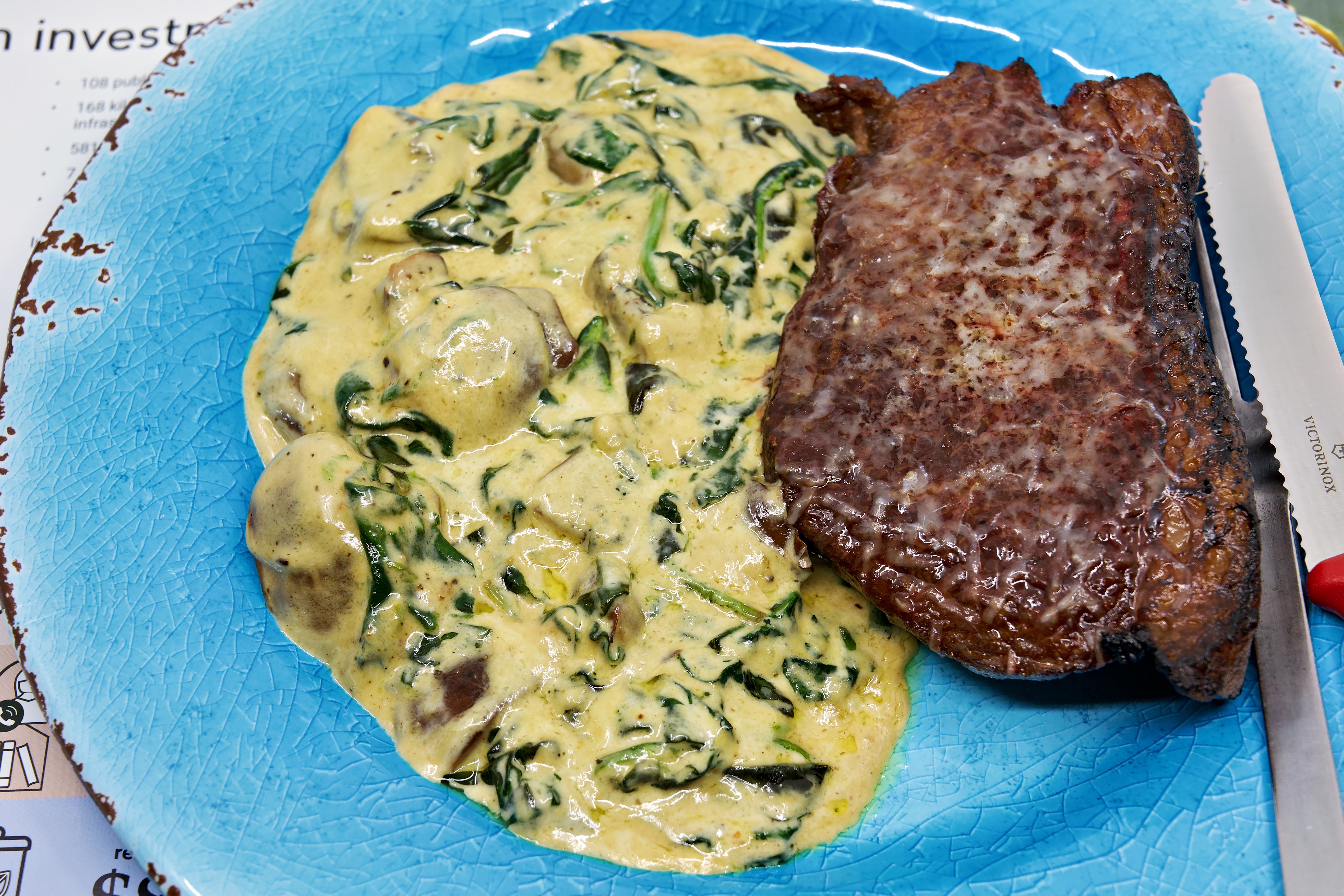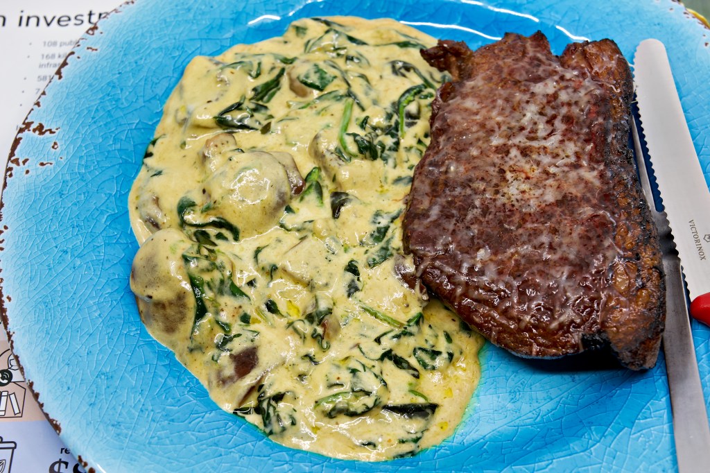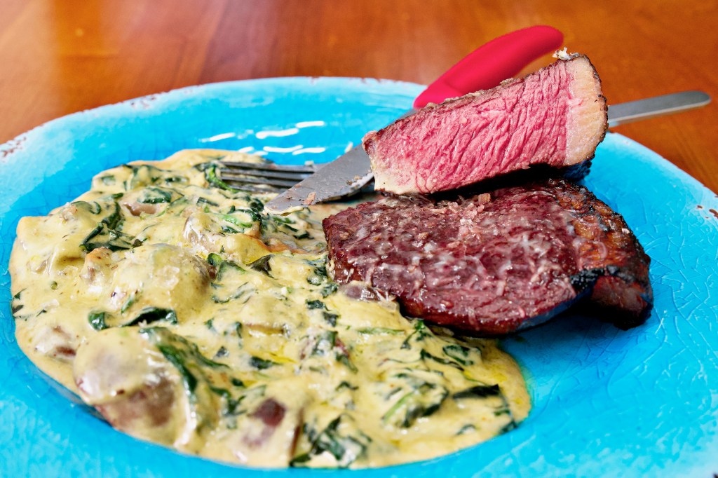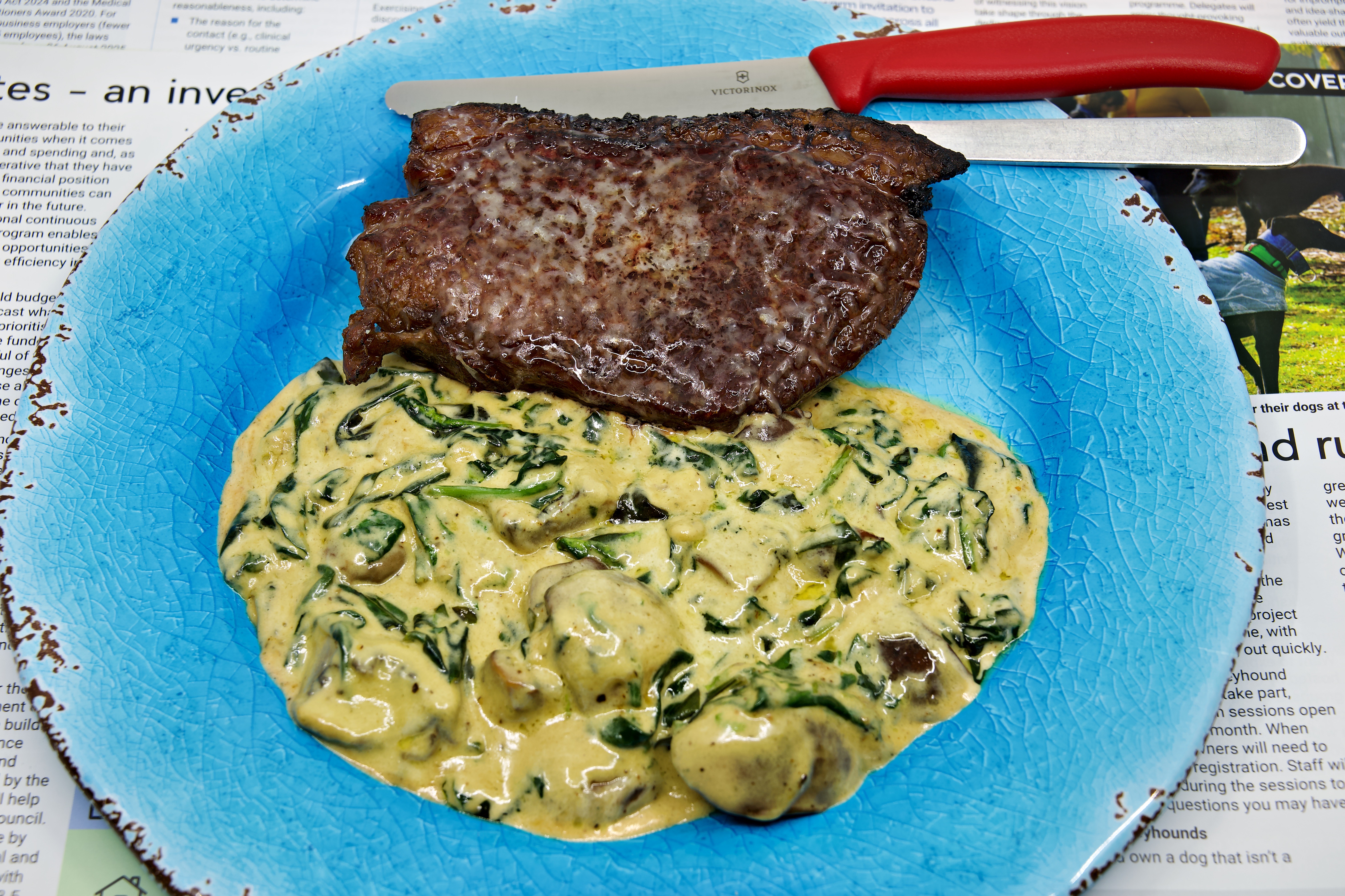 - I had the creamed spinach as a side dish with a rump cap steak. The steak and creamed spinach go well together.